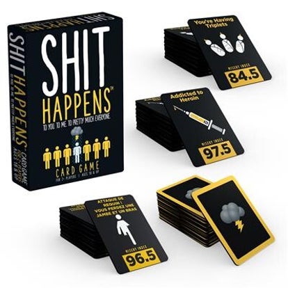 Shit happens.. Ja het leven valt niet mee.. Shit Happens is een hilarisch en weerzinwekkend, maar levensecht partyspel. Je komt allerlei ongewenste situaties tegen die je moet rangschikken op je lane of pain, die loopt van 1 tot 100. Wat is erger? Je vader in z'n nakie zien of elke nacht in bed plassen? Alle kaarten in dit spel hebben een ranking van 1 (niet erg) tot 100 (heel erg). Iedere speler krijgt 3 kaarten uitgedeeld, die je op tafel neer legt in gerangschikte volgorde (minst erg links, ergste rechts). Dit vormt de basis. Vervolgens leest de speler rechts een nieuwe kaart voor, zonder deze te laten zien. Het is nu aan de speler om te raden of deze nieuwe kaart milder of erger is dan de basis, of ergens tussenin. Raad je het goed? Dan leg je de kaart bij het rijtje neer. Wie het eerste 10 kaarten heeft liggen, wint het spel! Inhoud: 200 kaarten en een handleiding. Wordt geleverd in full-colour doosje. Geschikt voor 2 of meer spelers vanaf 18 jaar.